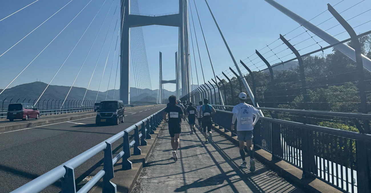 11キロあたりからアップダウンが始まり、戦略に則って上りは無理せず抑えて、下りは流すことを意識して走りました。ただ、思っていたより激しいアップダウンはなく、意外とこんなものなのか?と思っていると、14キロ地点で悪魔のような上りが始まりました。女神大橋は海抜65メートル、そこの高さまで一気に上るというなかなかの坂でした。前を走っていた人たちが途端に歩くようになり、周りからもなんだこの上り坂はという声も挙がっていましたが、私は気にせず腕を振って抑えめのペースで走り続けました。